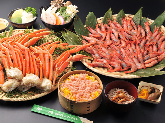 【お品書き(一例)】本ズワイガニ食べ放題、甘エビ食べ放題、カニわっぱ飯、赤城牛入りきのこのうどんすき、小鉢、香の物