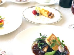 高台にあるレストランの窓から壮大な甲府盆地と葡萄畑を眺めながら評判の高いフレンチコースをお楽しみください。