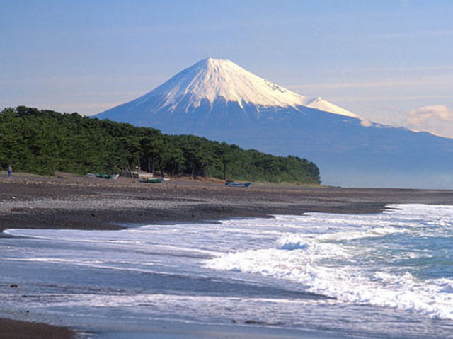天気が良い日に眺められ波打ち際から望む富士山は”圧巻”です!