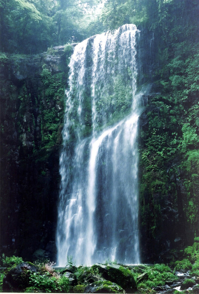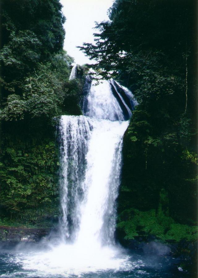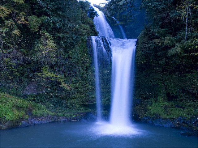天瀬町と玖珠町の境に位置する二段式滝で、豊かな水が細かいしぶきをたてながら流れ落ちる様が勇壮。別名「裏見の滝」とも呼ばれており、下滝に通っている遊歩道から落下する滝の裏側を見ることもできます!