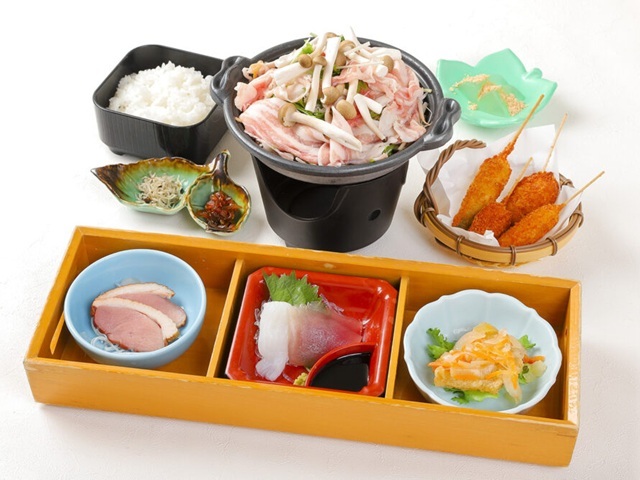 ・ヤマトポークの陶板焼き ・野菜の串盛り ・まぐろとイカのお造り