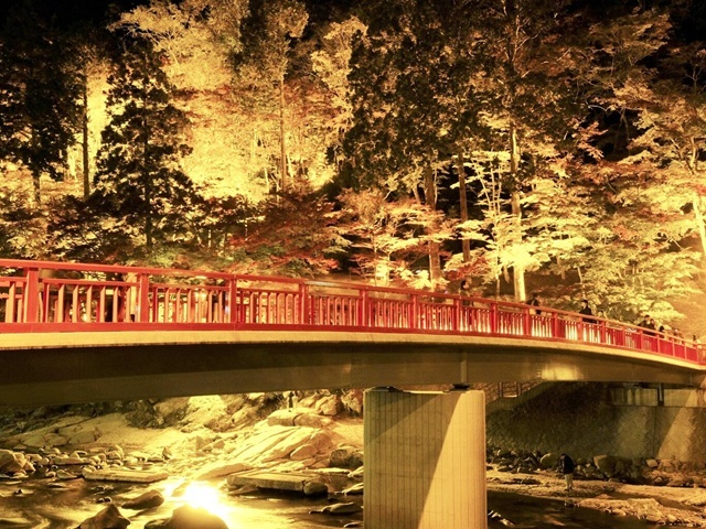 橋の上に立てば、両手に紅葉が広がる絶景が楽しめます。水辺から見上げるアングルはフォトスポットとしてもオススメです。